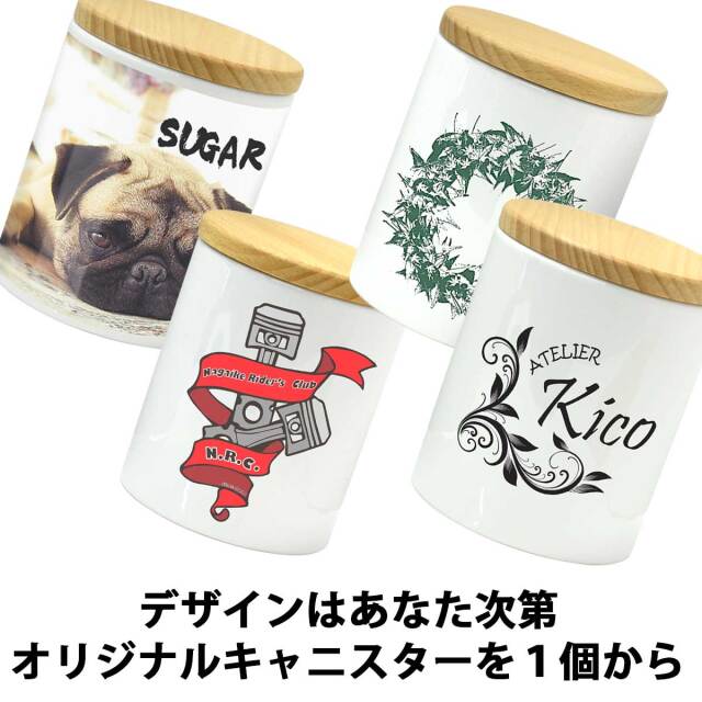 あなたが自由にデザインできる、オリジナルキャニスター。オリジナルデザインの名入れが簡単に可能。マークやテキスト、写真も自由に配置して素敵なキャニスターを今すぐ作れます。面倒な見積もりも不要。13時までの注文で即日出荷致します。しかも1個から作れます。ちょっとしたギフトに、仲間とお揃いにしたり、楽しみ方はいろいろ。精巧な昇華転写プリントによるプリントで、文字やマークはもちろんイラストや写真も表現できます。専用のデザインエディタをご用意し、仕上がりを確認してからご注文が出来ます。画像やテキストを組み合わせて、自由にデザインして下さい。エディタはパソコンやスマートフォンでもご利用可能。何度使っても無料です。普段遣いはもちろんプレゼントでも映える陶器製キャニスターへ、お客様のオリジナリティを加え、世界で一つだけのオリジナルキャニスターを作ってみませんか。