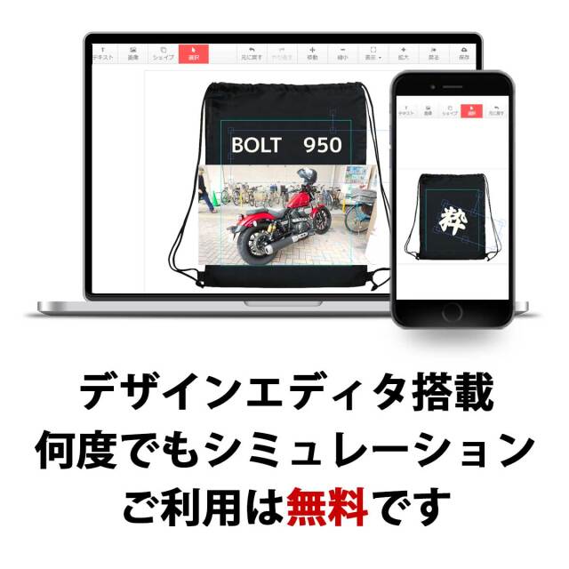 あなたが自由にデザインできる、オリジナルプリント・イベントリュック。マークやイラスト、お好きな文字や写真を自由に配置して素敵なオリジナルリュックサックを今すぐ作れます。面倒な見積もりも不要。13時までの注文で即日出荷致します。しかも1個から作れます。ちょっとしたギフトに、仲間とお揃いにしたり、楽しみ方はいろいろ。さらに、フルカラープリント対応。低温圧着によるプリントは洗濯強度に優れ、色落ちもほとんどありません。お子様の部活動の汚れ物入れや、イベント時の販促品、チームロゴで揃えたり、自治体の防災袋にしたりetc. あなただけのアイデアで楽しんで下さい。その場ですぐにデザインできます、当店では専用のデザインエディタをご用意し、エディタはパソコンでもスマートフォンでもご利用可能。エディタは何度使っても無料です。