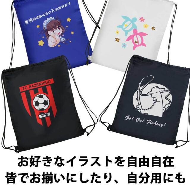 あなたが自由にデザインできる、オリジナルプリント・イベントリュック。マークやイラスト、お好きな文字や写真を自由に配置して素敵なオリジナルリュックサックを今すぐ作れます。面倒な見積もりも不要。13時までの注文で即日出荷致します。しかも1個から作れます。ちょっとしたギフトに、仲間とお揃いにしたり、楽しみ方はいろいろ。さらに、フルカラープリント対応。低温圧着によるプリントは洗濯強度に優れ、色落ちもほとんどありません。お子様の部活動の汚れ物入れや、イベント時の販促品、チームロゴで揃えたり、自治体の防災袋にしたりetc. あなただけのアイデアで楽しんで下さい。その場ですぐにデザインできます、当店では専用のデザインエディタをご用意し、エディタはパソコンでもスマートフォンでもご利用可能。エディタは何度使っても無料です。