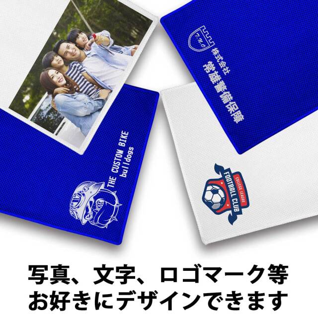 あなたが自由でデザインできる、オリジナル・涼感マフラータオルです。写真や画像、テキストを自由に追加して素敵なオリジナルグッズが、今すぐ作れます。面倒な見積もりも不要。13時までの注文で即日出荷致します。しかも1枚から作れます。ちょっとしたギフトに、仲間とお揃いにしたり、楽しみ方はいろいろ。どんなデザインもお任せください。フルカラープリント対応。低温圧着によるプリントは洗濯強度に優れ、色落ちもほとんどありません。