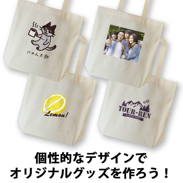あなたが自由でデザインできる、オリジナル・トートバッグ。写真や画像、テキストを自由に追加して素敵なトートバッグが、今すぐ作れます。面倒な見積もりも不要。13時までの注文で即日出荷致します。しかも1個から作れます。ちょっとしたギフトに、仲間とお揃いにしたり、楽しみ方はいろいろ。あなただけのオリジナルデザインで、個性的なトートバッグに早変わり。フルカラープリント対応でどんなデザインも再現できます。また、低温圧着によるプリントは洗濯強度に優れ、色落ちもほとんどありません。