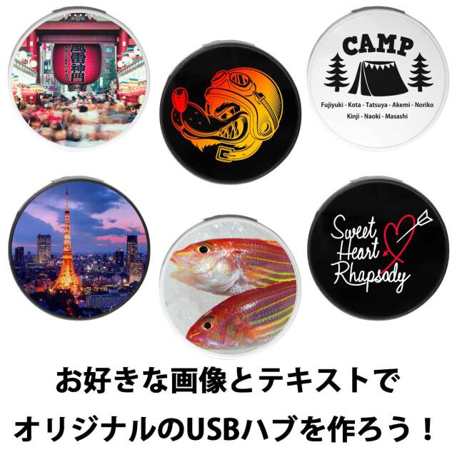 あなたが自由にデザインできる、オリジナルUSBハブラウンド。丸みのある形から可愛らしいUSBハブです。かわいい見た目に反しUSBポートも充実の4つ使用可能。写真やイラスト、テキストを自由に配置して素敵なオリジナルUSBハブラウンドを今すぐ作れます。面倒な見積もりも不要。13時までの注文で即日出荷致します。しかも1個から作れます。ちょっとしたギフトに、仲間とお揃いにしたり、楽しみ方はいろいろ。精巧なUVプリンターによる印刷で、文字はもちろん細かいイラストや写真画像も表現できます。文字の書体もお好きなものをお選びいただけますし、どんな画像でも自由に配置できます。また、プライマーを塗布していますのでプリントが剥がれにくい仕様です。