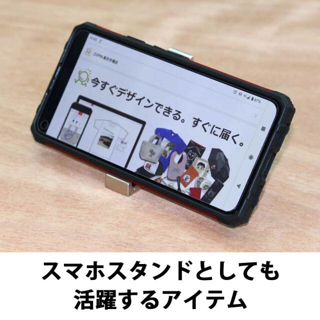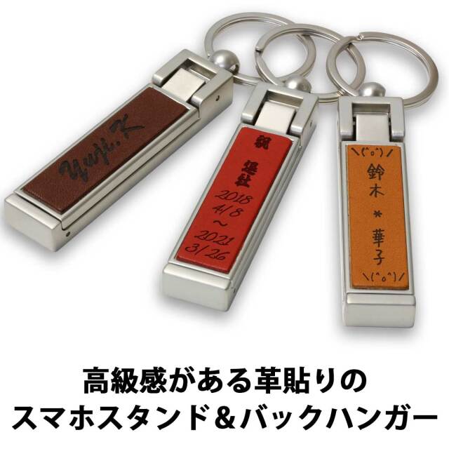 あなたが自由でデザインできる、オリジナルスマホスタンド&バッグハンガー。テキストを自由に追加して素敵なオリジナルのスマホスタンド&バッグハンガーが、今すぐ作れます。面倒な見積もりも不要。13時までの注文で即日出荷致します。しかも1個から作れます。ちょっとしたギフトに、仲間とお揃いにしたり、楽しみ方はいろいろ。精巧なレーザー加工機による彫刻加工で、文字精巧かつ綺麗に彫刻し表現できます。表面の本革へ焼付加工、裏面は金属部分にFiberレーザーによるマーキングを行います。書体もお好きな書体が選べますので、よりカスタムされたスマホスタンド&バッグハンガーが自分でデザインできます。印刷ではなくレーザー機による刻印のため、消えることがありません。業界初のデザインエディタを駆使して、個性的な世界でひとつだけのスマホスタンド&バッグハンガーを作ってみませんか?
