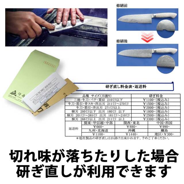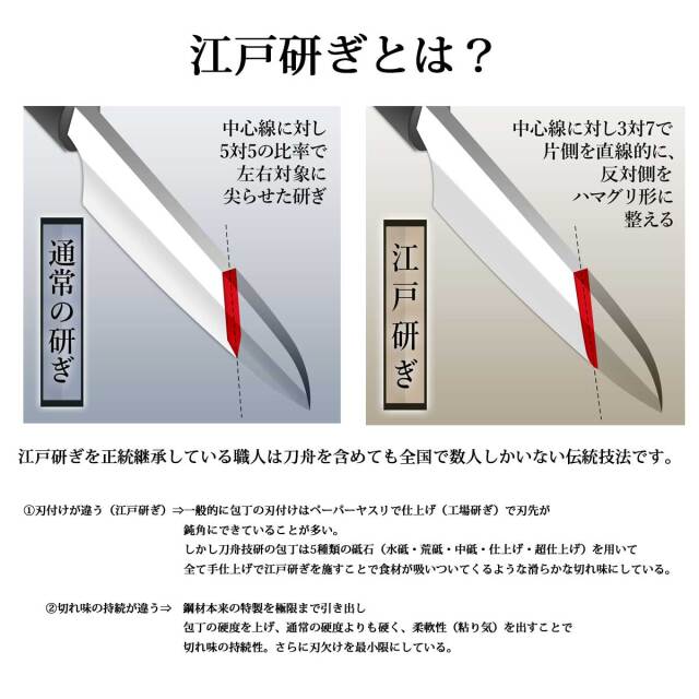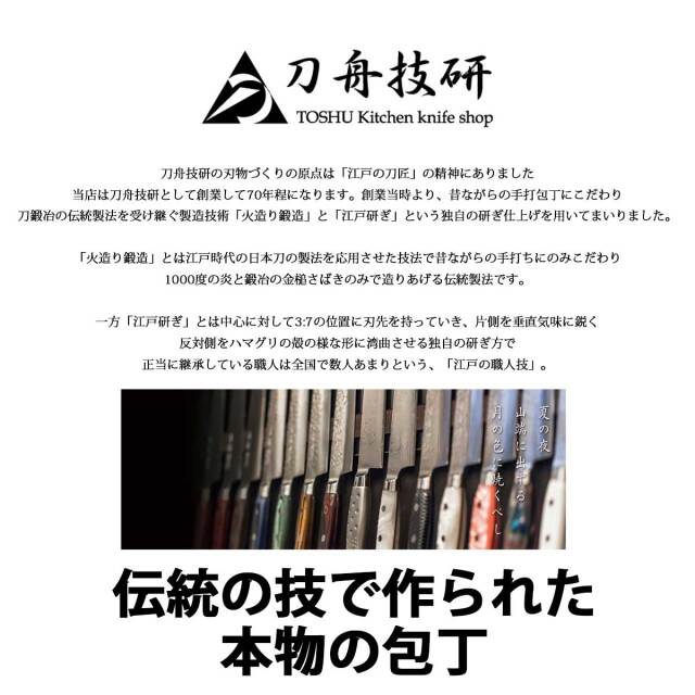 刀舟技研の三徳包丁は性能抜群ですが使用頻度により切れ味が低下した場合に研ぎ直しのサービスも行っております(刀舟技研の包丁のみ)。「江戸研ぎ」とは中心に対して3:7の位置に刃先を持っていき、片側を垂直気味に鋭く、反対側をハマグリの殻の様な形に湾曲させる独自の研ぎ方で正当に継承している職人は全国で数人あまりという、「江戸の職人技」で作られた包丁です。料理好きなあの人や、日頃の感謝の気持ちを込めたギフトにも最適。ラッピングも1個から無料で承ります。