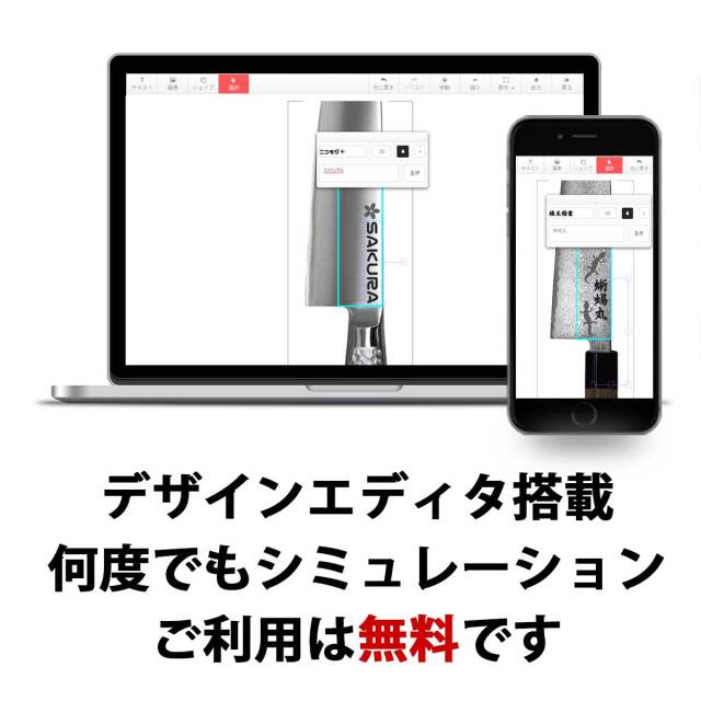 あなたが自由にデザインできる、刀舟技研のオリジナル三徳包丁。マークやテキストを自由に配置して素敵なオリジナル包丁を今すぐ作れます。面倒な見積もりも不要。13時までの注文で即日出荷致します。しかも1個から作れます。ちょっとしたギフトに、長く愛用できる一生モノの江戸研ぎ包丁。精巧なレーザー加工機による加工で、文字やマークはもちろんイラストも表現できます(写真は加工面の関係上不向きですのでご注意ください)。専用のデザインエディタをご用意し、包丁左側の柄側の面へお好きなデザインを入れることができます。レーザーによるマーキングですので、塗料は使っておらず、洗浄を繰り返しても図柄が消えることがなく、衛生的にも安心です。大切な人へ、ご自宅用に、世界で一つだけのオリジナル名入れ包丁で、本格的な料理の頼れるパートナーとしても最適。エディタはパソコンでもスマートフォンでもご利用可能。何度使っても無料です。