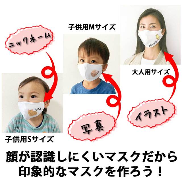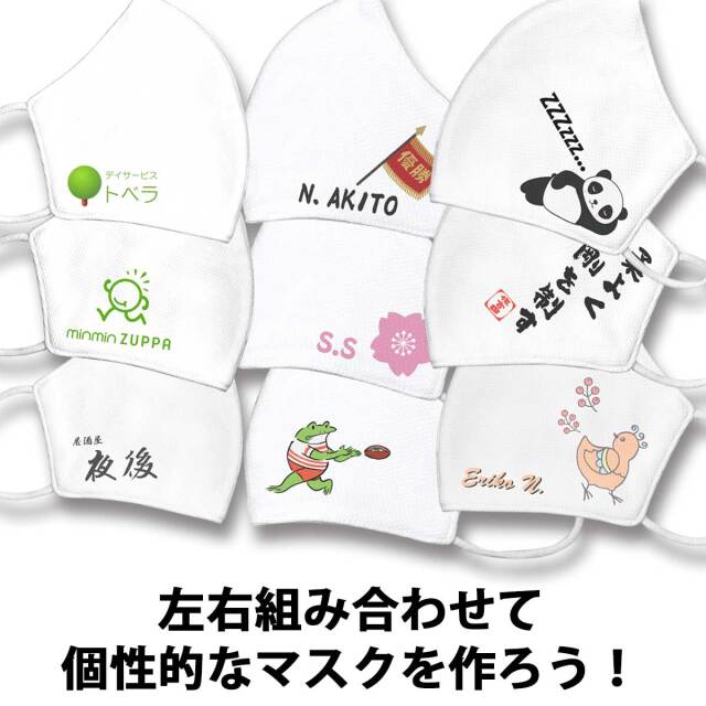 あなたが自由でデザインできる、オリジナルマスク。写真や画像、テキストを自由に追加して素敵なマスクが、今すぐ作れます。面倒な見積もりも不要。13時までの注文で即日出荷致します。しかも1枚から作れます。ちょっとしたギフトに、仲間とお揃いにしたり、楽しみ方はいろいろ。専用のエディタをご用意しておりますので、誰でも簡単に、いますぐデザインできます。エディタはパソコンでもスマートフォンでもご利用可能。エディタは何度もプレビューでき、何回使っても無料です。ロゴやお好きなメッセージを自由に、簡単にレイアウトできます。フルカラー対応で写真の表現も可能。どんなデザインでもお任せ下さい。また、低温圧着によるプリントは洗濯強度に優れ、色落ちもほとんどありません