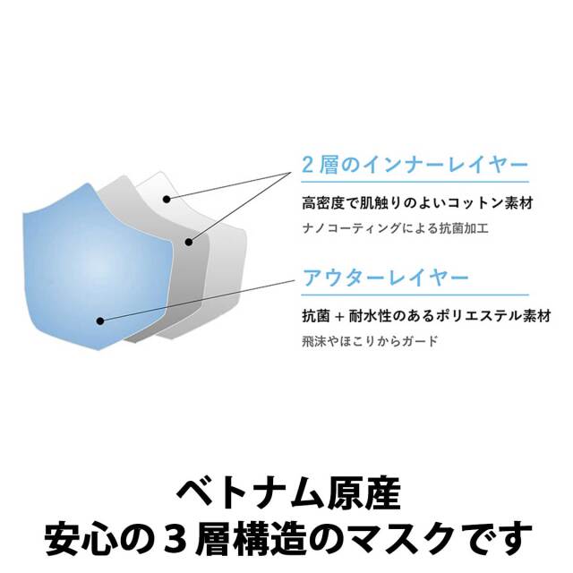こちらのマスクは繊維大国のベトナム製。繰り返し30回まで洗って使うことができます。コットンとポリエステルからなる多層構造で、つけ心地と抗菌、防水性能を両立させた、高機能マスクです。オリジナルデザインを左右に分けてデザインできます。非対称デザインやワンポイントのデザインがおしゃれでおすすめ。お子様用にお名前を入れたり、仲間で揃えたり、ファッションの一部として、ギフトとしてetc.実用性、デザイン性に優れたオリジナルマスク作りに挑戦しましょう。ラッピングも無料で承りますので、ギフトとしても最適です。