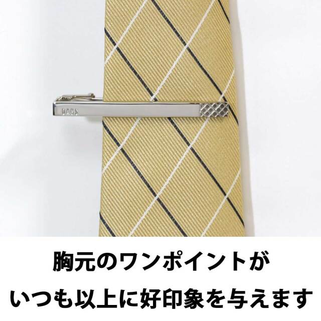 あなたが自由でデザインできる、オリジナル・ネクタイピン(タイバー)。お好きな文字を自由に追加して素敵なオリジナルのネクタイピンが、今すぐ作れます。面倒な見積もりも不要。13時までの注文で即日出荷致します。しかも1枚から作れます。ちょっとしたギフトに、仲間とお揃いにしたり、楽しみ方はいろいろ。ネクタイピンの裏側にダイヤモンドカッターでしっかりと彫刻します。使い込んでも薄くならず、消えることもない、しっかりとした彫刻です。熟練の加工スタッフが丁寧に一品ずつ彫刻いたします。デザイン面ではなく、裏側のクリップ面にさり気なく名入れするのがおすすめです。しかも、当店では専用のエディタをご用意していますので、仕上がりをイメージしながらお客様ご自身でデザインが出来ます。書体も3種類からお選びいただけます。はやければわずか数分でデザインが完了します。あとは届くのを待つだけ。世界でひとつだけのオリジナル・ネクタイピンをあなたも作ってみませんか。