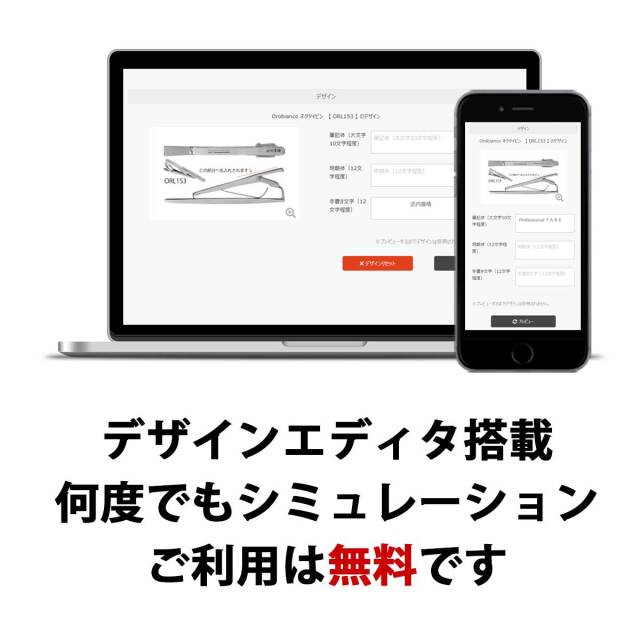 あなたが自由でデザインできる、オリジナル・ネクタイピン(タイバー)。お好きな文字を自由に追加して素敵なオリジナルのネクタイピンが、今すぐ作れます。面倒な見積もりも不要。13時までの注文で即日出荷致します。しかも1枚から作れます。ちょっとしたギフトに、仲間とお揃いにしたり、楽しみ方はいろいろ。ネクタイピンの裏側にダイヤモンドカッターでしっかりと彫刻します。使い込んでも薄くならず、消えることもない、しっかりとした彫刻です。熟練の加工スタッフが丁寧に一品ずつ彫刻いたします。デザイン面ではなく、裏側のクリップ面にさり気なく名入れするのがおすすめです。しかも、当店では専用のエディタをご用意していますので、仕上がりをイメージしながらお客様ご自身でデザインが出来ます。書体も3種類からお選びいただけます。はやければわずか数分でデザインが完了します。あとは届くのを待つだけ。世界でひとつだけのオリジナル・ネクタイピンをあなたも作ってみませんか。